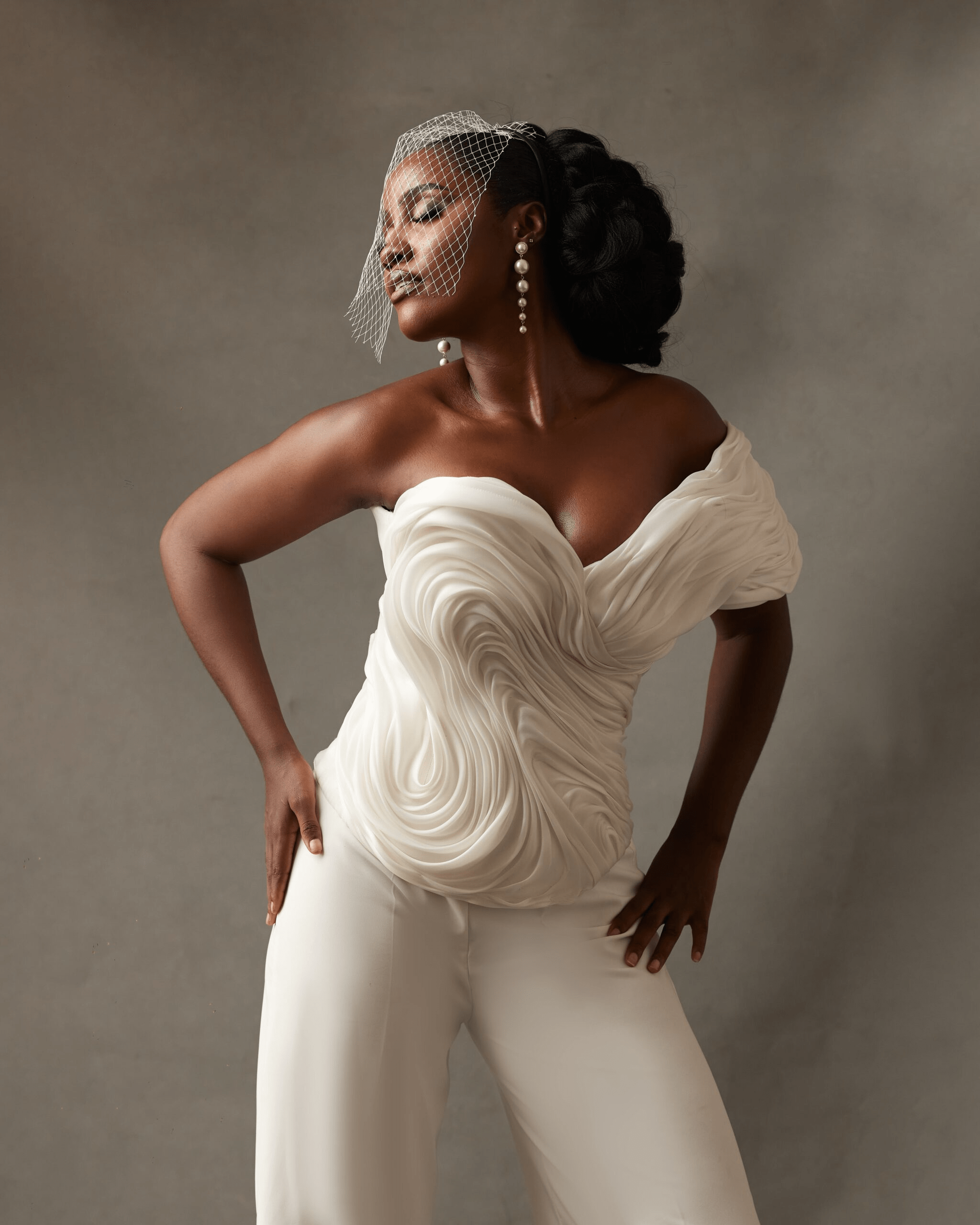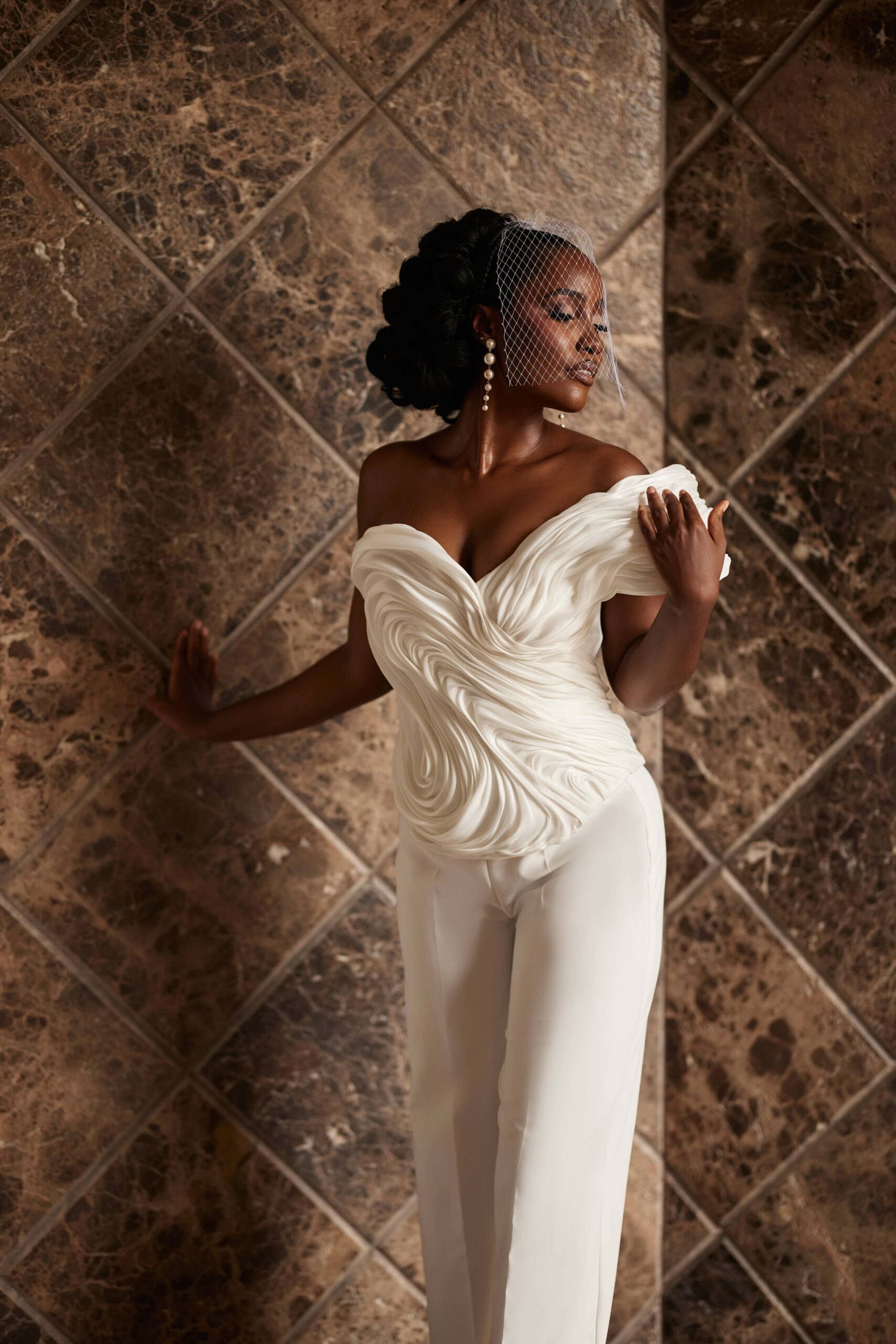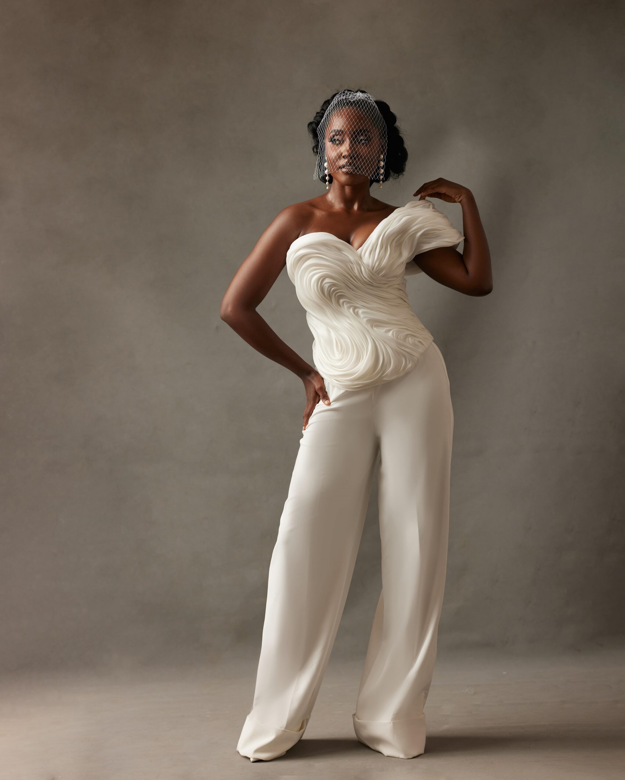 The in-seam corset lacing sculpts your body while the textured drape work captures the grace of movement beneath the surface. Perfect as a bridal separate for your civil ceremony, dinner or an unforgettable event.