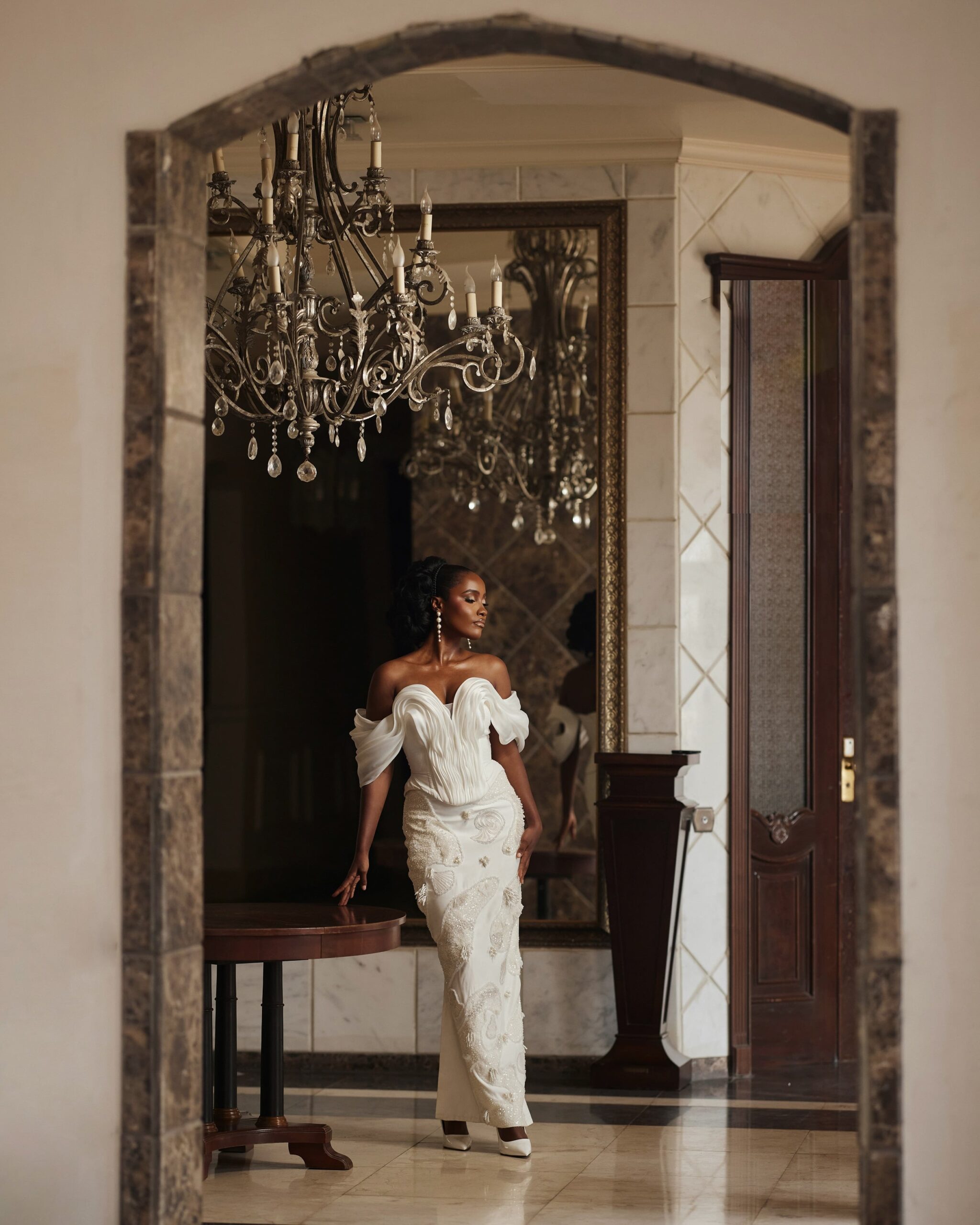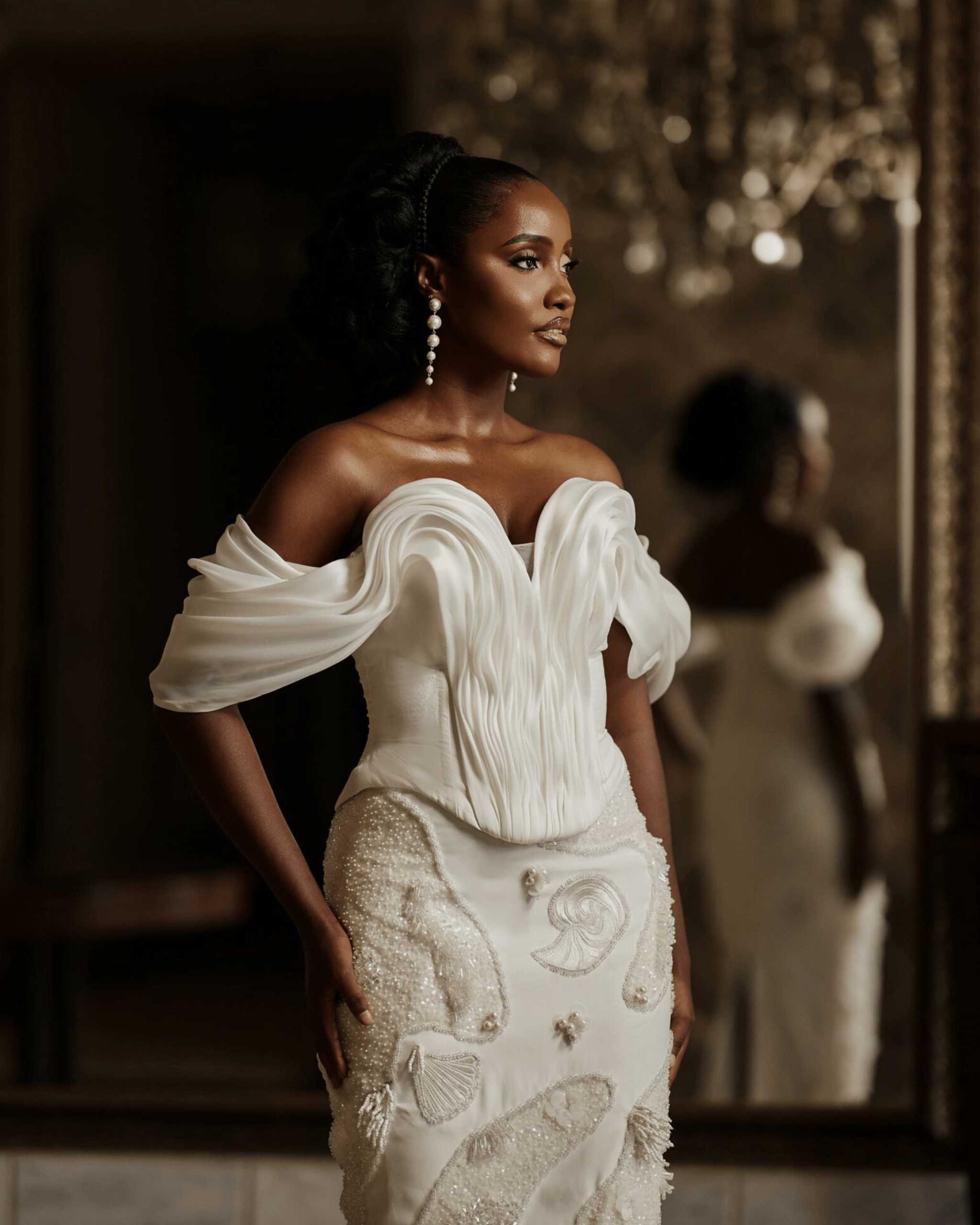 Reef is an off shoulder top featuring exquisite fluid drapery that embodies poise and freedom, making her excellent for ceremonies, brunch parties or an unforgettable night out.